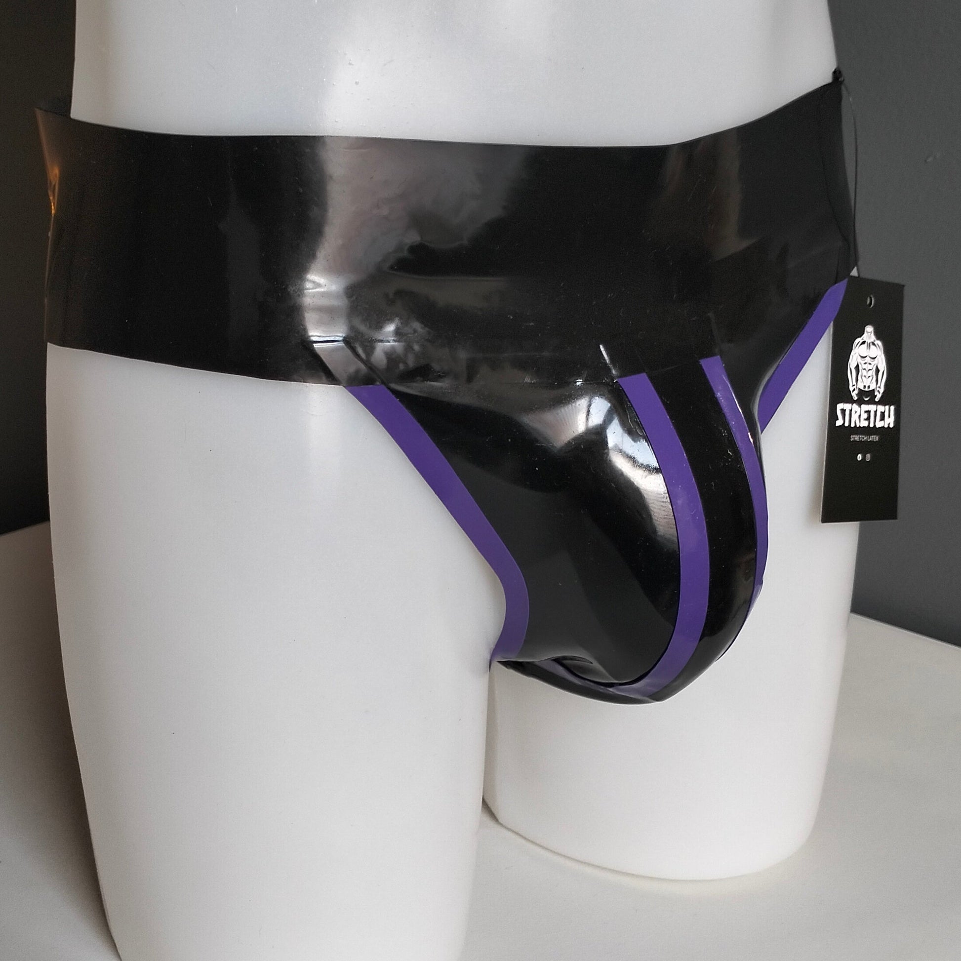 This latex jock comprises of a 7cm, 0.8mm thick Waistband for extra grip; 0.6mm cheek-bands for a supported lift and a striped 0.4mm front pouch.