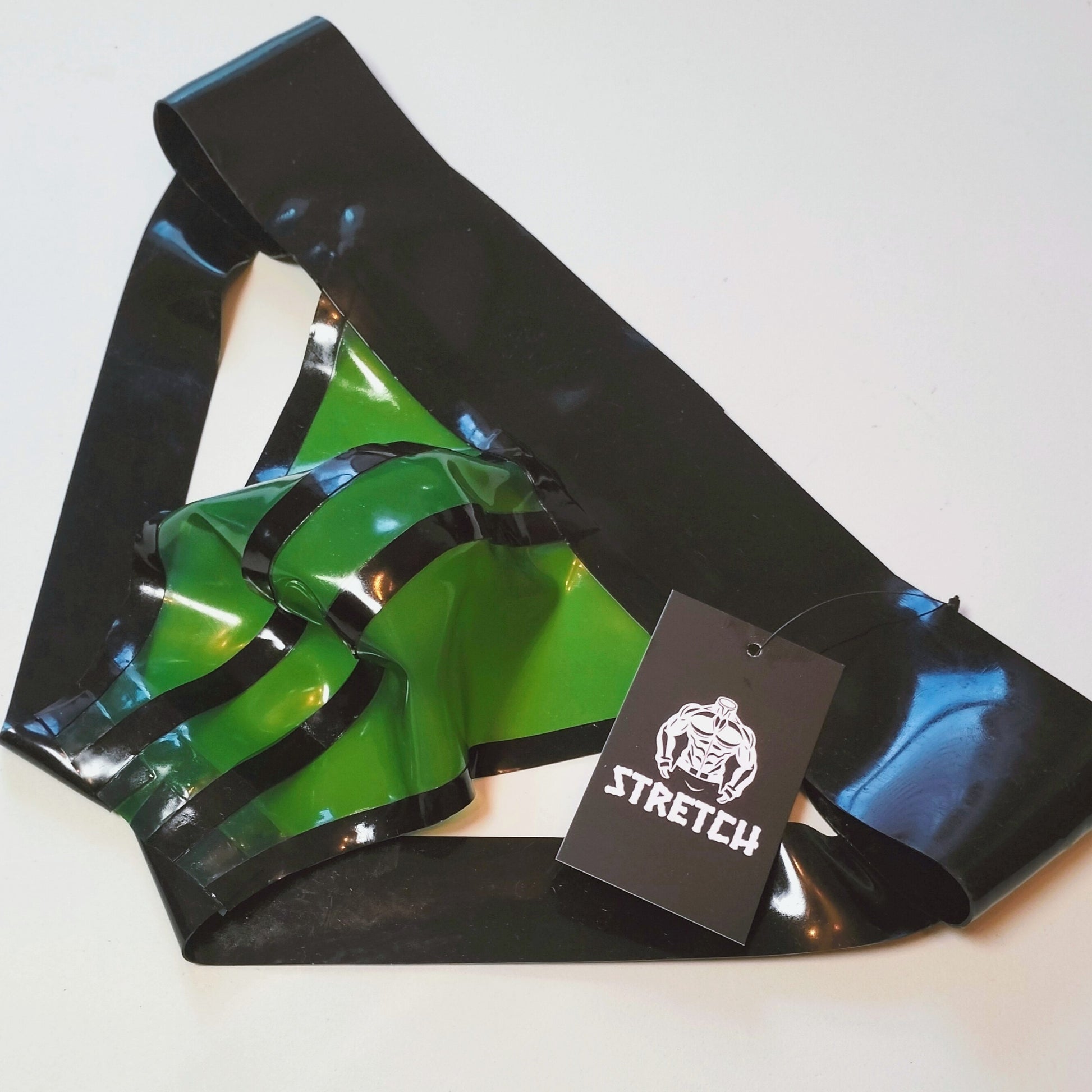 This latex jock comprises of a 7cm, 0.8mm thick Waistband for extra grip; 0.6mm cheek-bands for a supported lift and a striped 0.4mm front pouch.