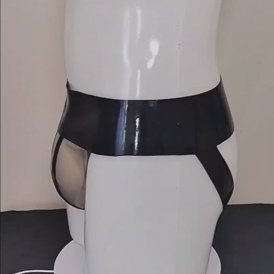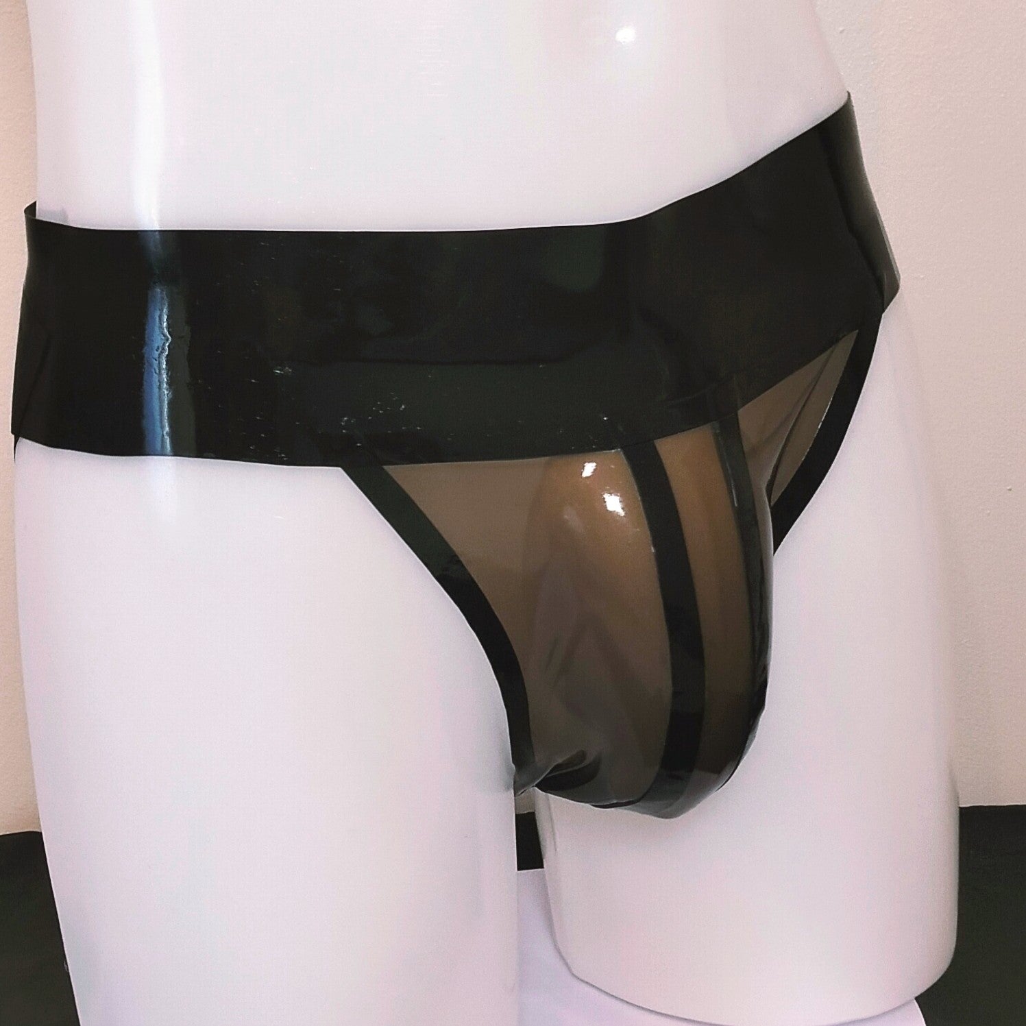 This latex jock comprises of a 7cm, 0.8mm thick Waistband for extra grip; 0.6mm cheek-bands for a supported lift and a striped 0.4mm front pouch.